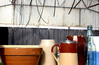 Here are more customers and vendors. The lady on the left was carrying this bouquet of old red handled kitchen implements. The girls in the middle are sisters who frequent our sales and the lady on the right, Kelli, made her smock from a table cloth she got at flea.o.logy last summer!!